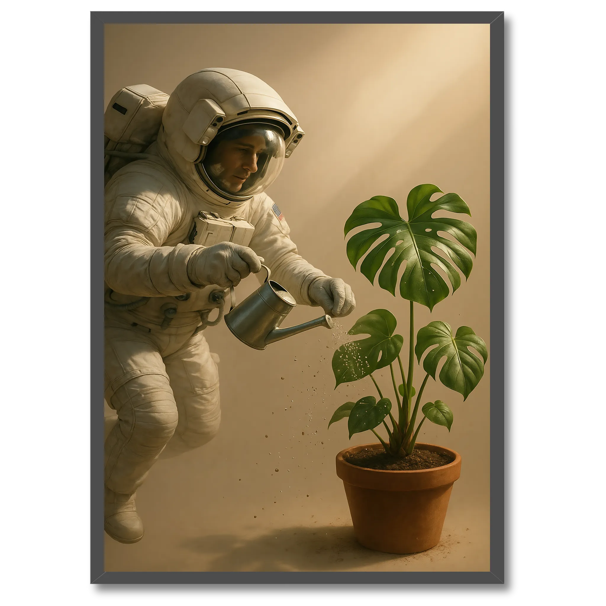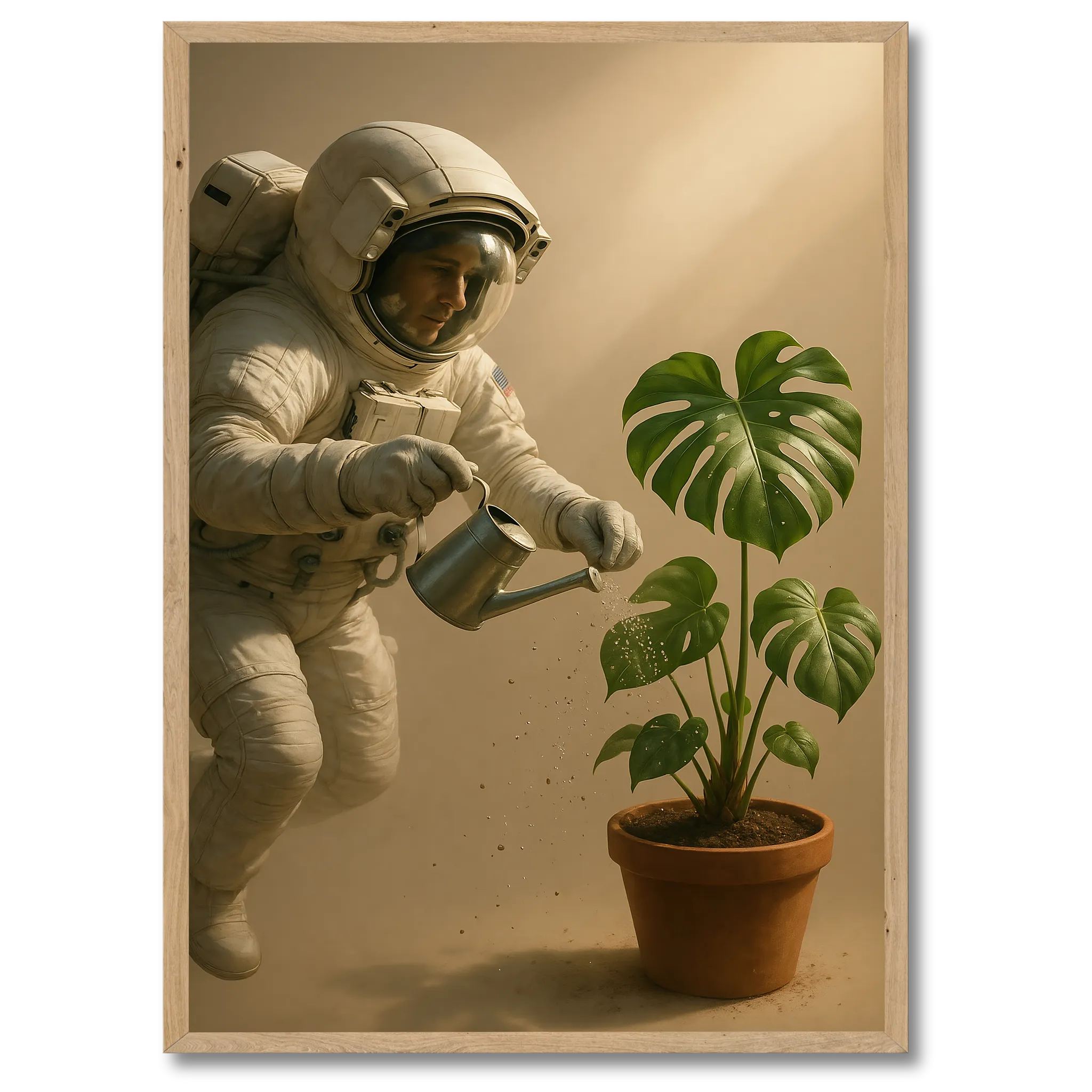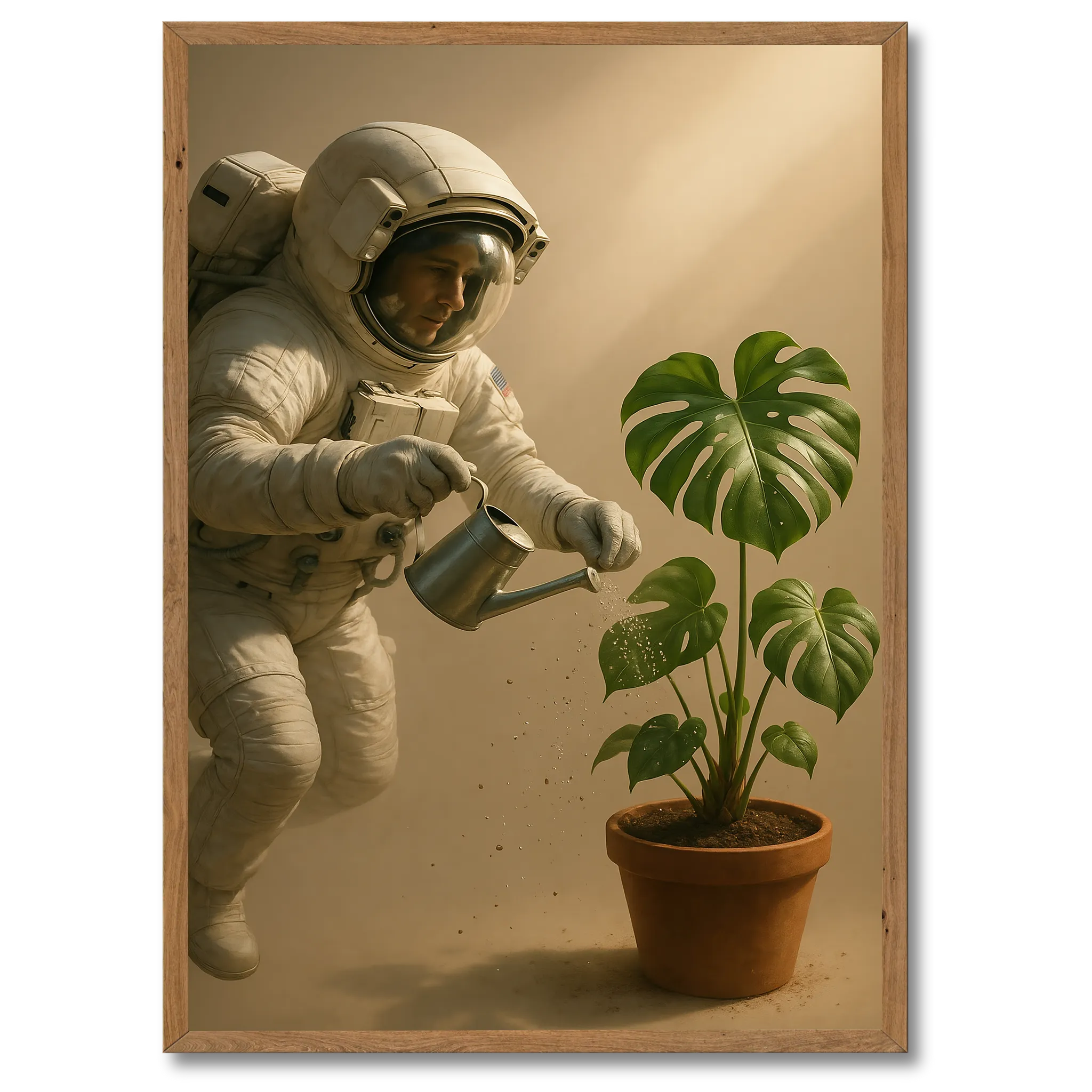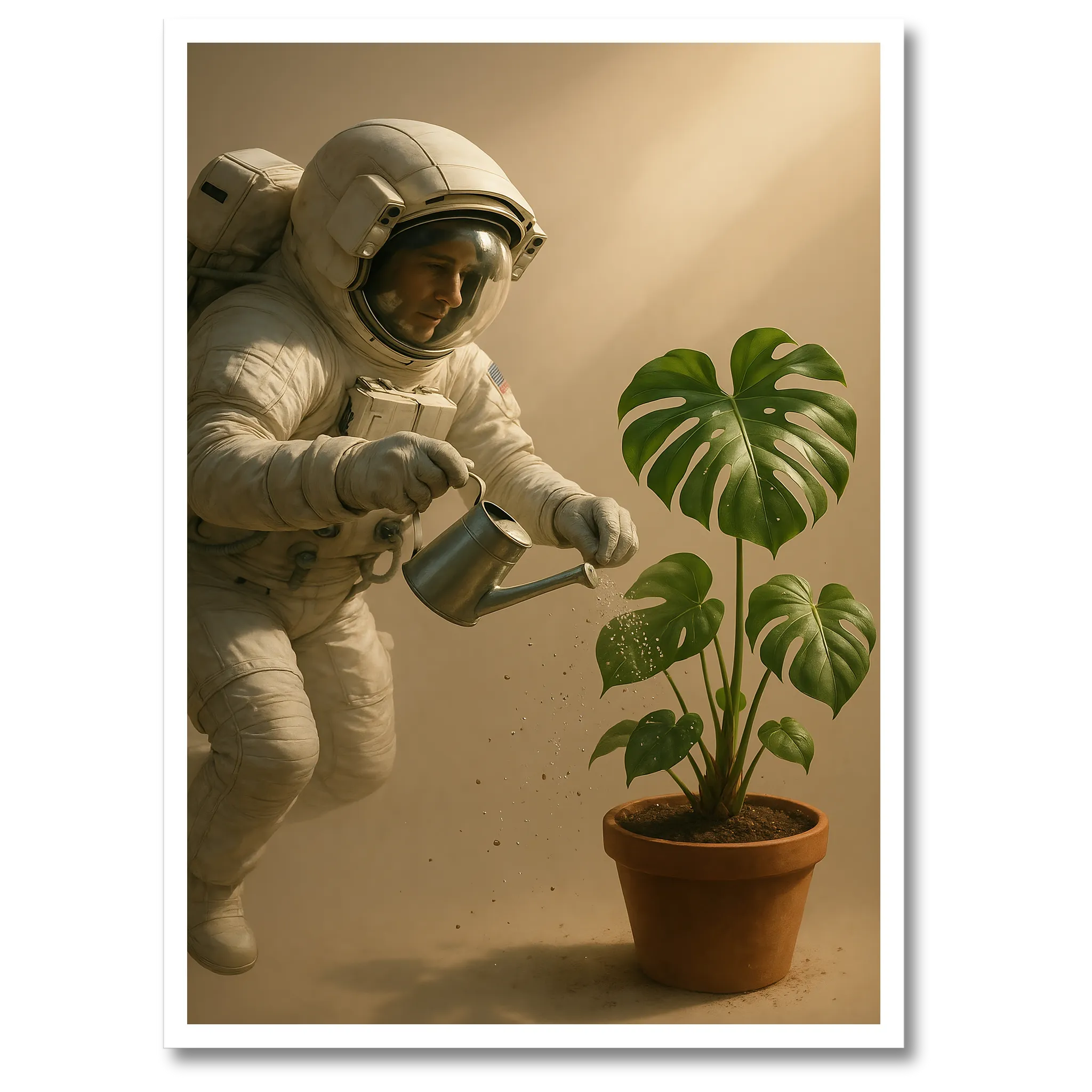 Det humoristiske ligger i selve situationen: en astronaut i fuld rumdragt, der bruger sin tid på at vande en stueplante. Men bag humoren gemmer sig også et poetisk budskab – nemlig at vi aldrig kan undslippe vores forbindelse til naturen. Selv i rummet længes vi efter grønt liv og vækst. Plakaten fungerer derfor både som en sjov illustration og en stille reminder om, hvor vigtig naturen er for os.