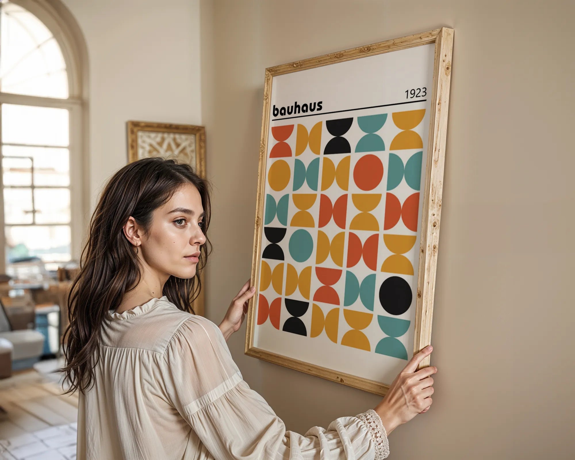 Bauhaus nr. 5-poster är inspirerad av den tyska Bauhaus-skolan, en banbrytande konst- och designskola från tidigt 1900-tal. Postrarna är minimalistiska och enkla, med fokus på geometriska former, färger och tydlig typografi. En stilren och modern poster för det samtida hemmet. Hos oss kan du själv välja färgtema på din poster.