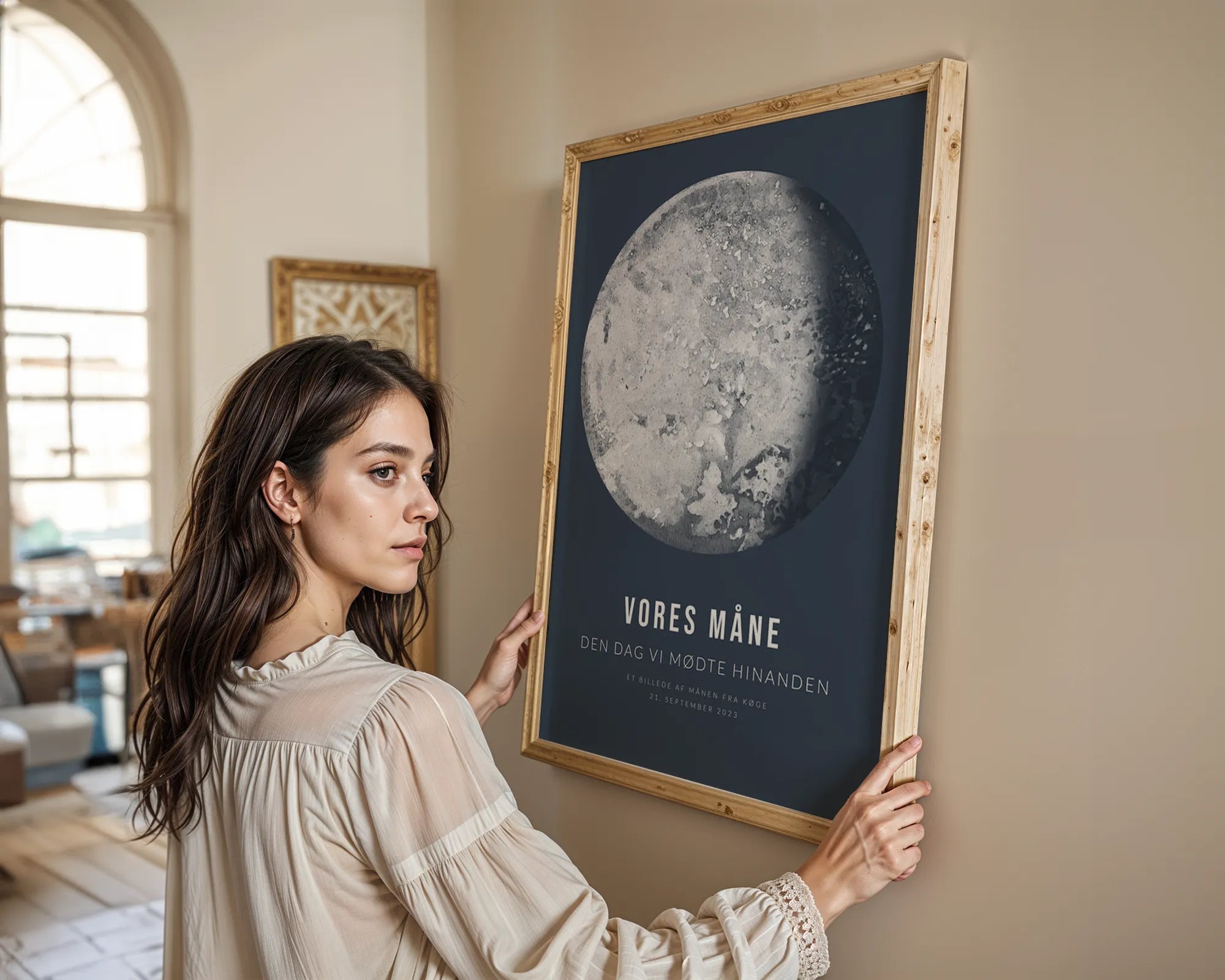 Skab en personlig og unik plakat med denne smukke måneplakat. Du udfylder selv teksten, og så laver vi månen, som den så ud på netop din specielle dag.
