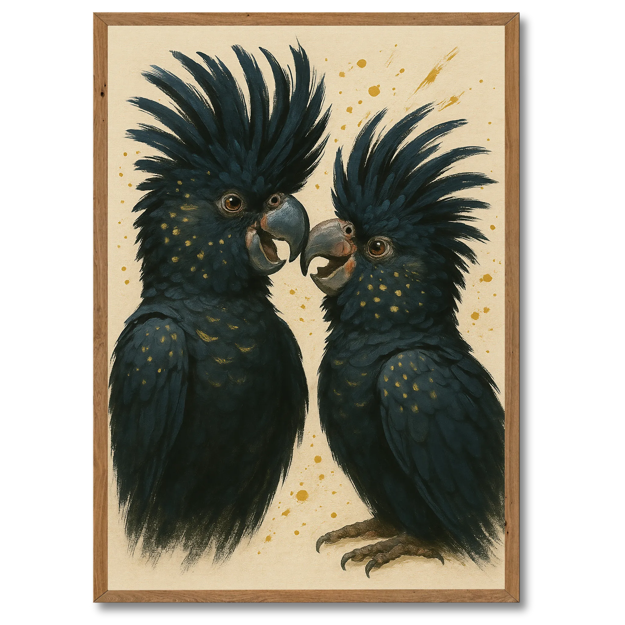 Der er få fugle, der kan måle sig med kakaduens udtryk. Sorte kakaduer plakat fanger denne majestætiske fugl i en dramatisk og farverig illustration, der kombinerer elegance, energi og mystik. Med deres kraftige næb, vilde fjerpragt og intense øjne er kakaduerne både smukke og imponerende – og det er netop det, denne plakat får frem. Den er perfekt til dig, der ønsker at tilføre dit hjem et kunstnerisk motiv med masser af personlighed.