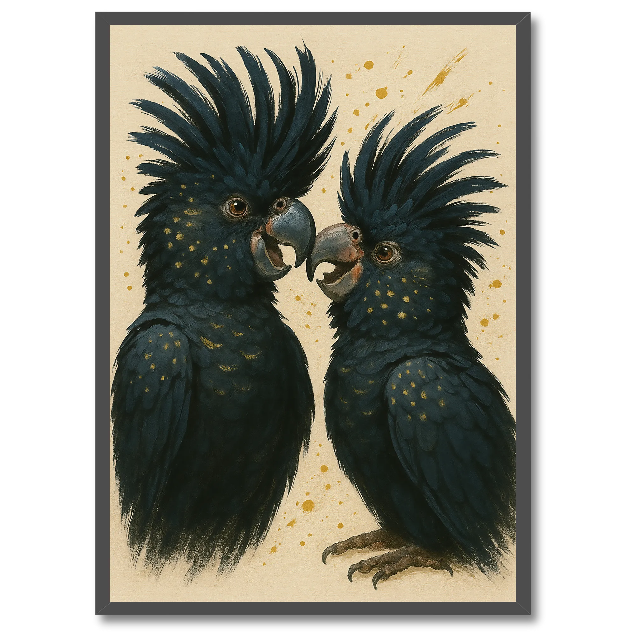 Sorte kakaduer er kendt for deres dramatiske udseende, og i denne illustration står det særligt klart. De sorte fjer med glimt af farver giver en følelse af dybde og intensitet, mens fuglenes kraftfulde silhuet understreger styrke og frihed. Motivet er detaljeret, men samtidig stilrent, hvilket gør det nemt at kombinere med andre plakater eller lade det stå alene som blikfang.