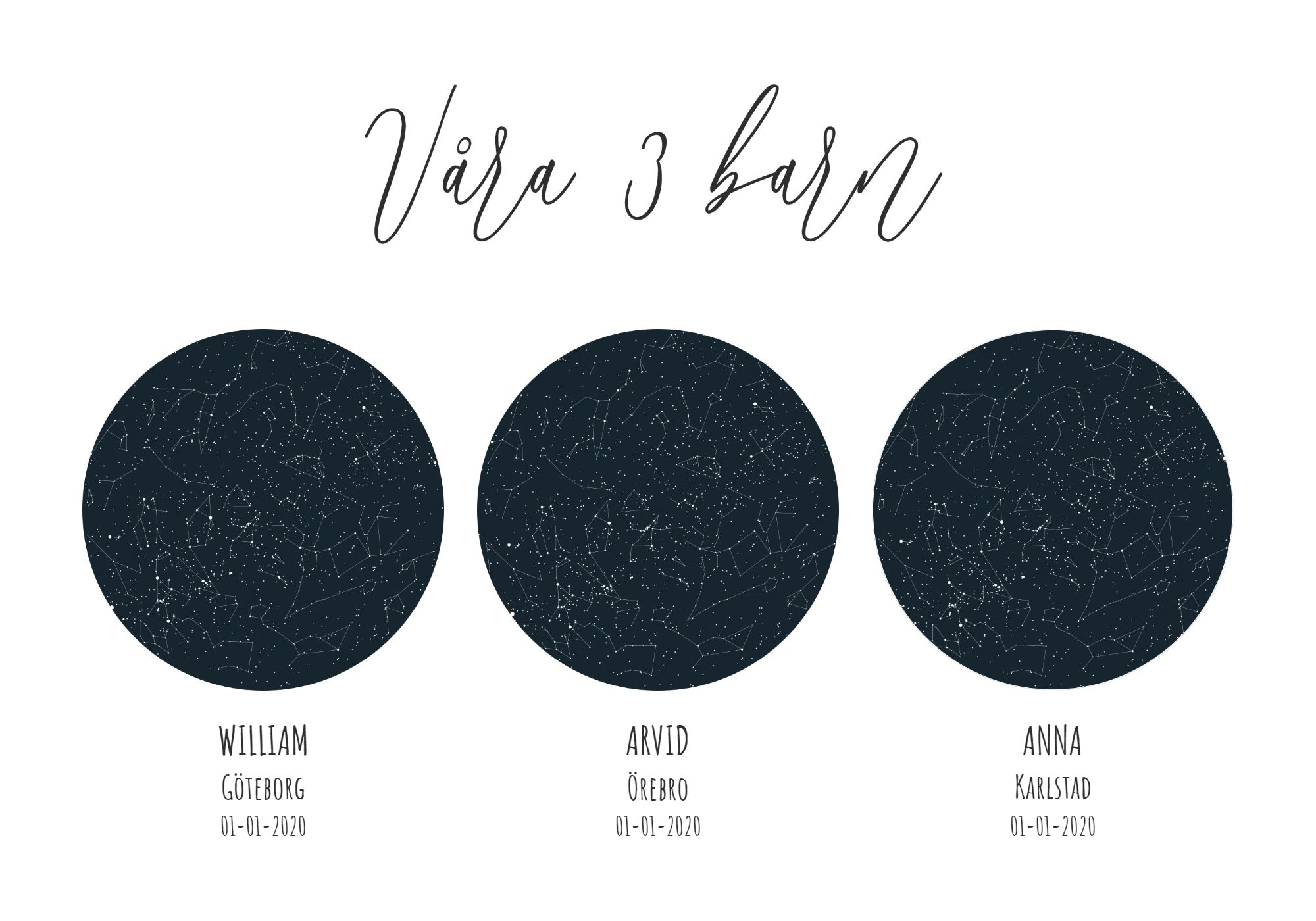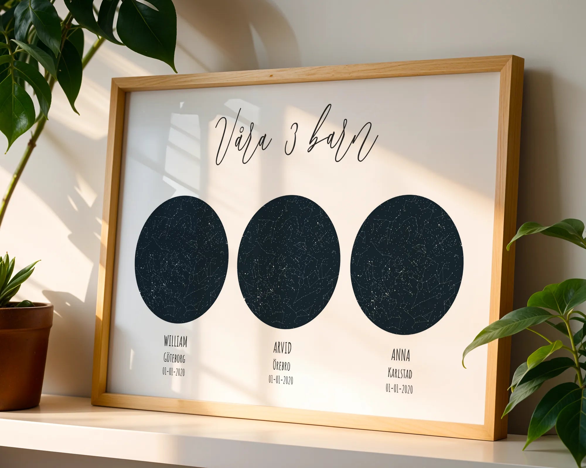 Gör dina minnen till konst med vår trippel stjärnhimmel poster. Föreviga tre speciella dagar och låt stjärnorna berätta historien om de ögonblick som betyder mest för dig. Beställ din stjärnbild poster idag och skapa ett vackert och meningsfullt tillskott till ditt hem.