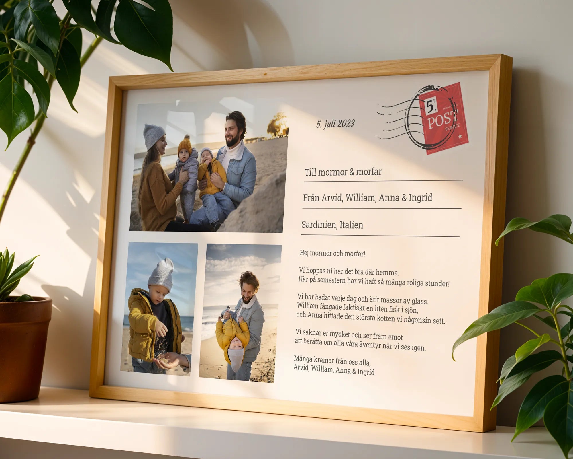 Skriv en hjärtevärmande hälsning: Dela dina känslor och minnen från semestern genom att lägga till en personlig hälsning. Berätta hur mycket du saknar dem och dela några av dina favoritögonblick från resan – precis som du gör med ett traditionellt vykort.